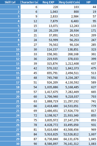 The table below uses the HP passive skill as an example of upgrade requirements.