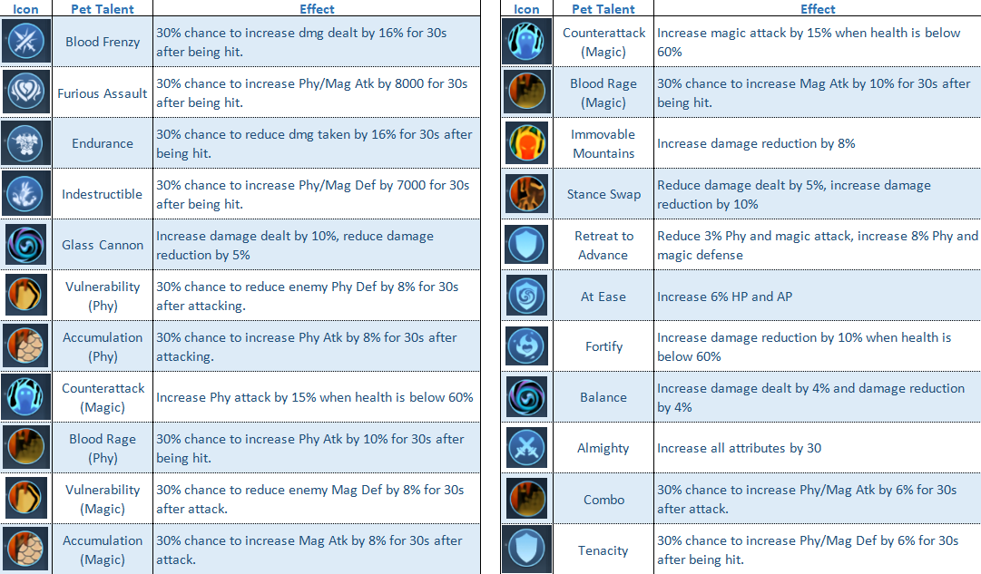 Each pet has 1–3 random talents.