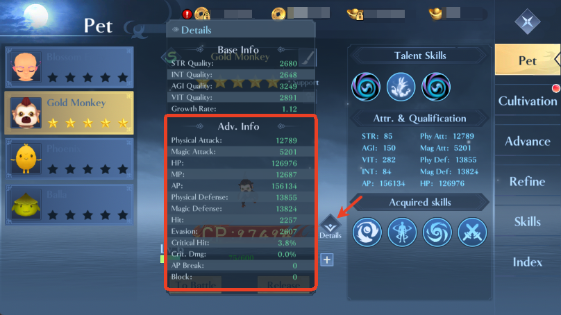 Check the Pet Details [Adv. Info] for final values.