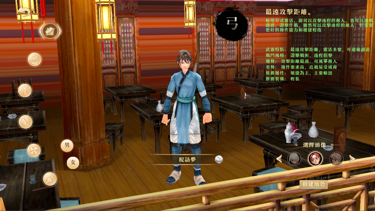 可選擇:俠客(男) 或 俠女(女)。