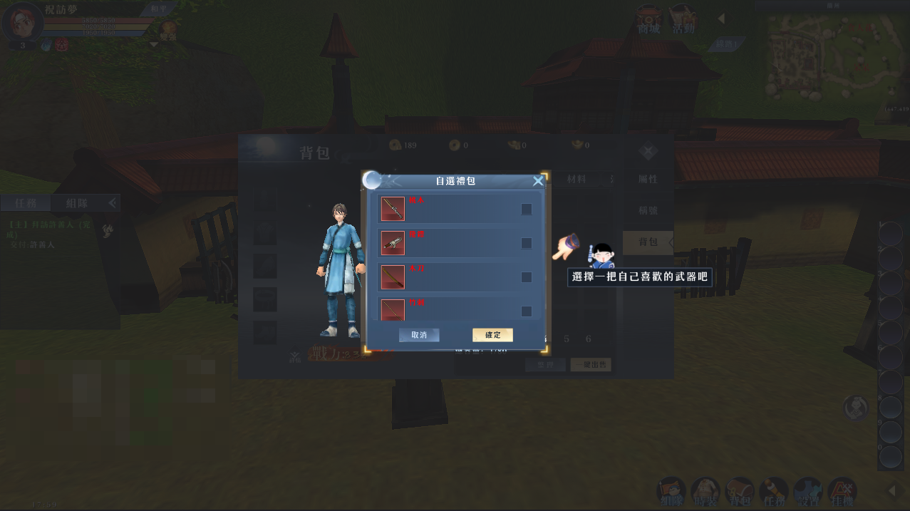 可選武器共六種:刀、拳、劍、槍、弓、暗器。