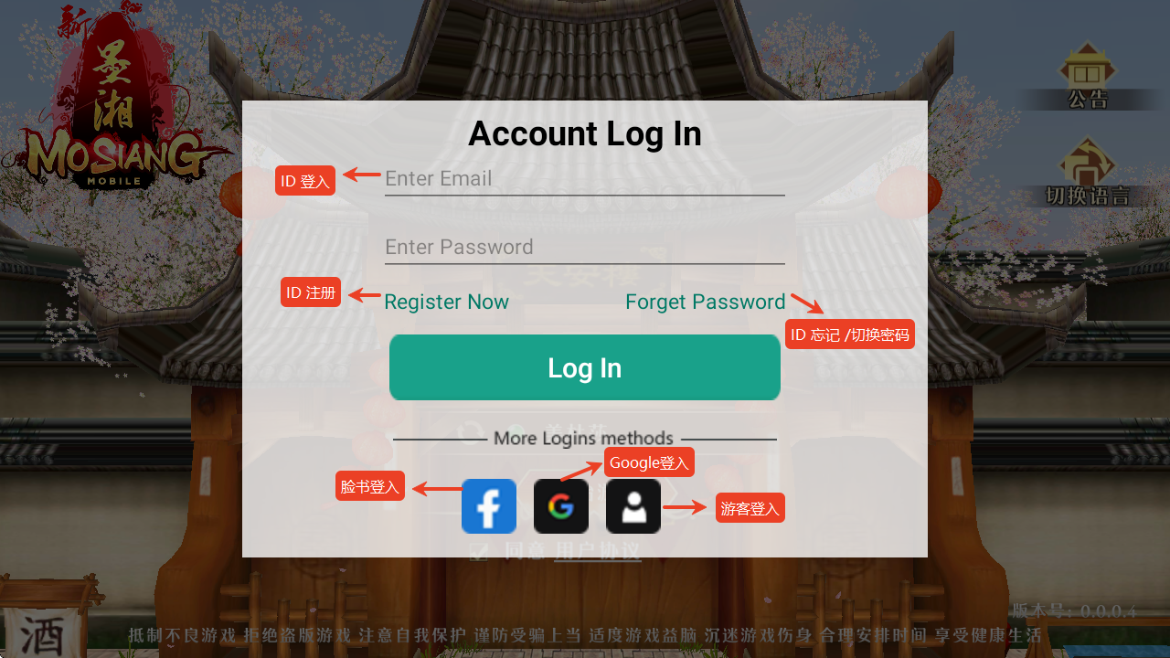 1)Android:支援 ID 登入、Google 登入、Facebook 登入、遊客登入