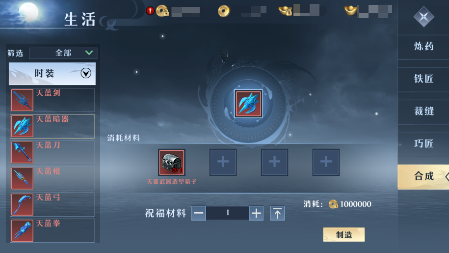 前往【生活界面】→【合成】→选择「其他」→「时装」,合成您想要的武器。